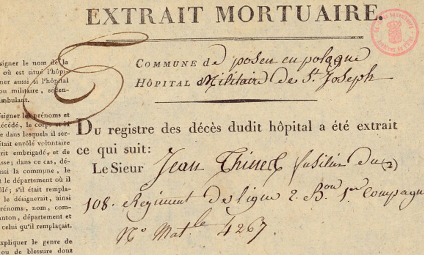 Jean himself likely did not make it to the front. The War of the Fourth Coalition had ended in July of 1807. We find in his death record that by December 28th, 1807, he was in a hospital in Posen (Poznan), where he remained until he died about four months later.